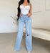 Step up your fashion game with our High Rise High Waist Distressed Ripped Cut Out Front Asymmetrical Knees Straight Legs Loose Fit Baggy Boyfriend Jeans. These trendy women's denim jeans are designed to provide both style and comfort, making them a must-have addition to your wardrobe.