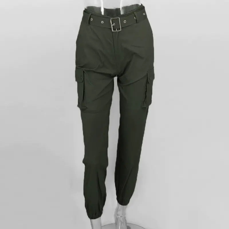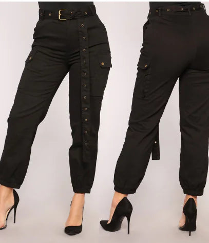 Our cargo trousers feature a high waist design that elongates the legs while providing a snug fit at the ankles, making them a versatile addition to your wardrobe. Whether you're dressing up for a night out or keeping it casual for a day of errands, these trousers will keep you looking stylish and feeling confident.